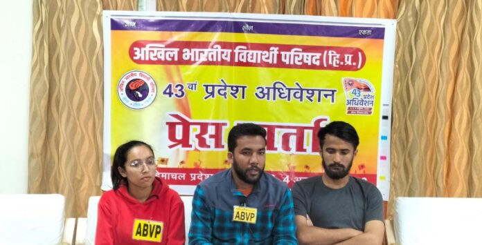 सोलन। अखिल भारतीय विद्यार्थी परिषद की प्रेस वार्ता का आयोजन प्रदेश सह मंत्री विक्रांत चौहान जी द्वारा सोलन में किया। अखिल भारतीय विद्यार्थी परिषद के प्रदेश सह मंत्री विक्रांत चौहान ने पत्रकारों को संबोधित कर जानकारी देते हुए कहा कि अभाविप का प्रांत अधिवेशन प्रति वर्ष प्रदेश के अलग अलग स्थानों में आयोजित किया जाता है। इस वर्ष 43वें प्रदेश अधिवेशन को आयोजन करवाने का सौभाग्य अभाविप सोलन ज़िला को प्राप्त हुआ है। अभाविप सोलन ज़िला के कार्यकर्ता दिन रात अधिवेशन के सफल आयोजन हेतु प्रयासरत है।