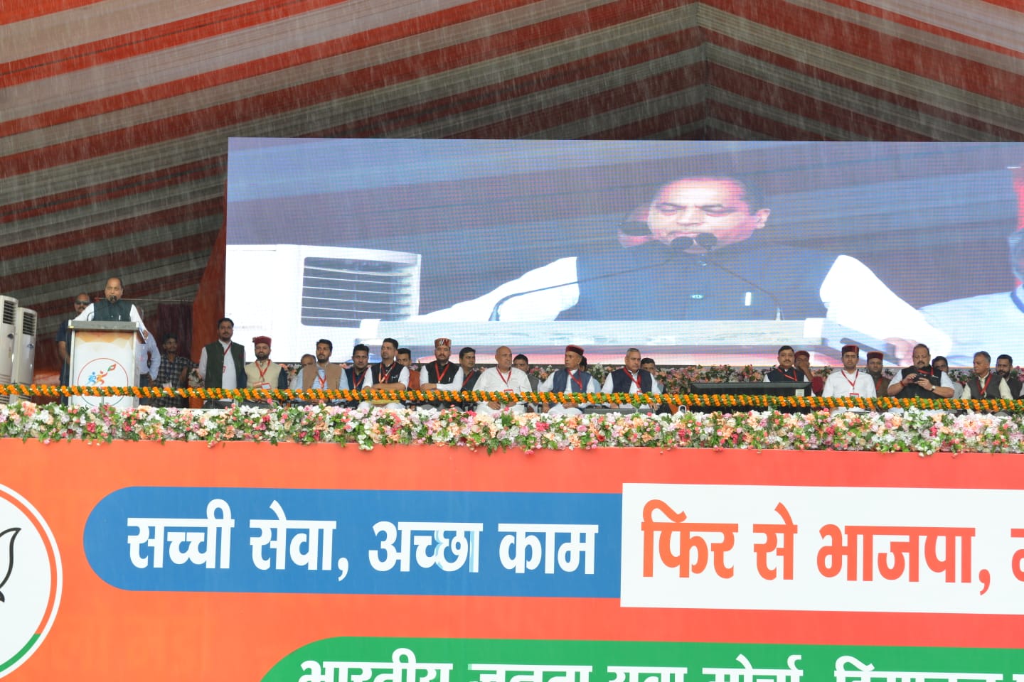 दरअसल खराब मौसम के चलते प्रधानमंत्री नरेन्द्र मोदी मंडी नहीं पहुंच सके। इसलिए उन्होंने रैली को वर्चुअली संबोधित किया। बारिश के बीच भी युवा पड्ड मैदान में जुटे रहे। बारिश से बचने के लिए कुछ युवकों ने कुर्सियों का सहारा लिया। वर्चुअल माध्यम से संबोधित कर रहे प्रधानमंत्री ने कहा कि हिमाचल का प्यार, हिमाचल के आशीर्वाद, हिमाचल के प्रति मेरा लगाव उसके बीच में तो मौसम और मुसीबतें भी नहीं आ सकती हैं, इस बार मैं नहीं आया पाया लेकिन जल्द ही आपके बीच आऊंगा। मौसम खराब होने की वजह से मंडी नहीं पहुंच पाने पर प्रधानमंत्री नरेंद्र मोदी ने कार्यकर्ताओं से माफी भी मांगी। पीएम नरेन्द्र मोदी ने कहा, ‘क्षमाप्रार्थी हूं कि मौसम खराब होने के कारण आपके बीच नहीं आ सका हिमाचल आने की बात होती है तो मैं उत्साहित हो उठता हूं, लेकिन इस बार आपसे रूबरू होने की कसक मन में रह गई है