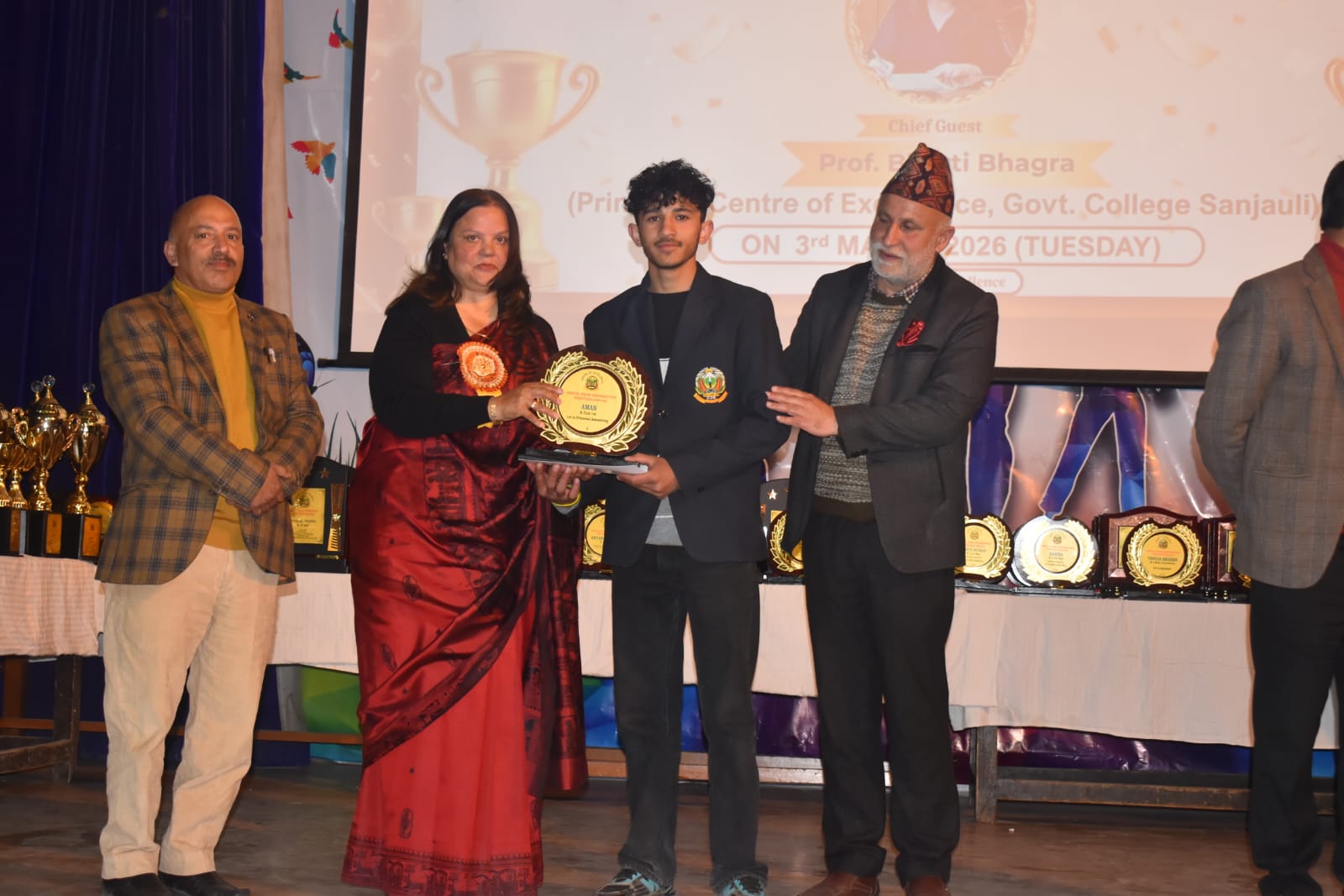 शिमला । राजकीय महाविद्यालय संजौली में 3 मार्च 2026 को वार्षिक पारितोषिक वितरण समारोह का शानदार आयोजन किया गया, जिसकी अध्यक्षता कॉलेज की प्रधानाचार्या प्रो. भारती भागड़ा ने बतौर मुख्य अतिथि की। समारोह के दौरान विभिन्न श्रेणियों में उत्कृष्ट प्रदर्शन करने वाले लगभग 500 विद्यार्थियों को उनकी उपलब्धियों के लिए पुरस्कृत किया गया, जिनमें विश्वविद्यालय स्तर के टॉपर, राष्ट्रीय स्तर के खिलाड़ी और अन्य विस्तार गतिविधियों में नाम रोशन करने वाले छात्र भी शामिल रहे। सत्र 2024-25 में, विश्वविद्यालय के शीर्ष 10 स्थानों में से 5 पर बी.कॉम अंतिम वर्ष के छात्रों ने बाजी मारी है। विजेताओं में वे छात्र भी शामिल हैं जिन्होंने ‘खेलो इंडिया’ में भाग लिया, साथ ही कुछ ऐसे छात्र भी हैं जिनका चयन निशानेबाजी में भारत का प्रतिनिधित्व करने के लिए हुआ है। इसके अतिरिक्त, हिमाचल प्रदेश विश्वविद्यालय (HPU) के युवा महोत्सव और खेल प्रतियोगिताओं में स्थान पाने वाले छात्रों तथा अंतरराष्ट्रीय मंचों पर देश का गौरव बढ़ाने वाले विद्यार्थियों को भी पुरस्कारों से नवाजा गया।