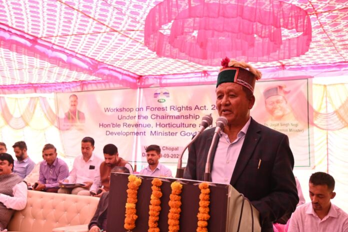चौपाल| हिमाचल प्रदेश के राजस्व, बागवानी, जनजातीय विकास एवं लोक शिकायत निवारण मंत्री जगत सिंह नेगी की अध्यक्षता में लोक निर्माण विभाग के विश्राम गृह चौपाल में वन अधिकार अधिनियम, 2006 से संबंधित एक महत्वपूर्ण कार्यशाला का आयोजन किया गया। कार्यशाला का उद्देश्य अधिनियम की जटिलताओं को सरल भाषा में समझाना तथा पात्र लाभार्थियों तक इसका लाभ पारदर्शिता के साथ पहुँचाना रहा। इस कार्यक्रम की विशेषता यह रही कि कैबिनेट मंत्री ने स्वयं संचालन करते हुए अधिकारियों और ग्रामीण जनता को अधिनियम की बारीकियों से अवगत कराया। उन्होंने बताया कि यह अधिनियम ऐतिहासिक पृष्ठभूमि में क्यों और कैसे अस्तित्व में आया तथा इसका मुख्य उद्देश्य वन क्षेत्रों में रहने वाले पात्र लोगों को उनके अधिकार दिलाना है।
