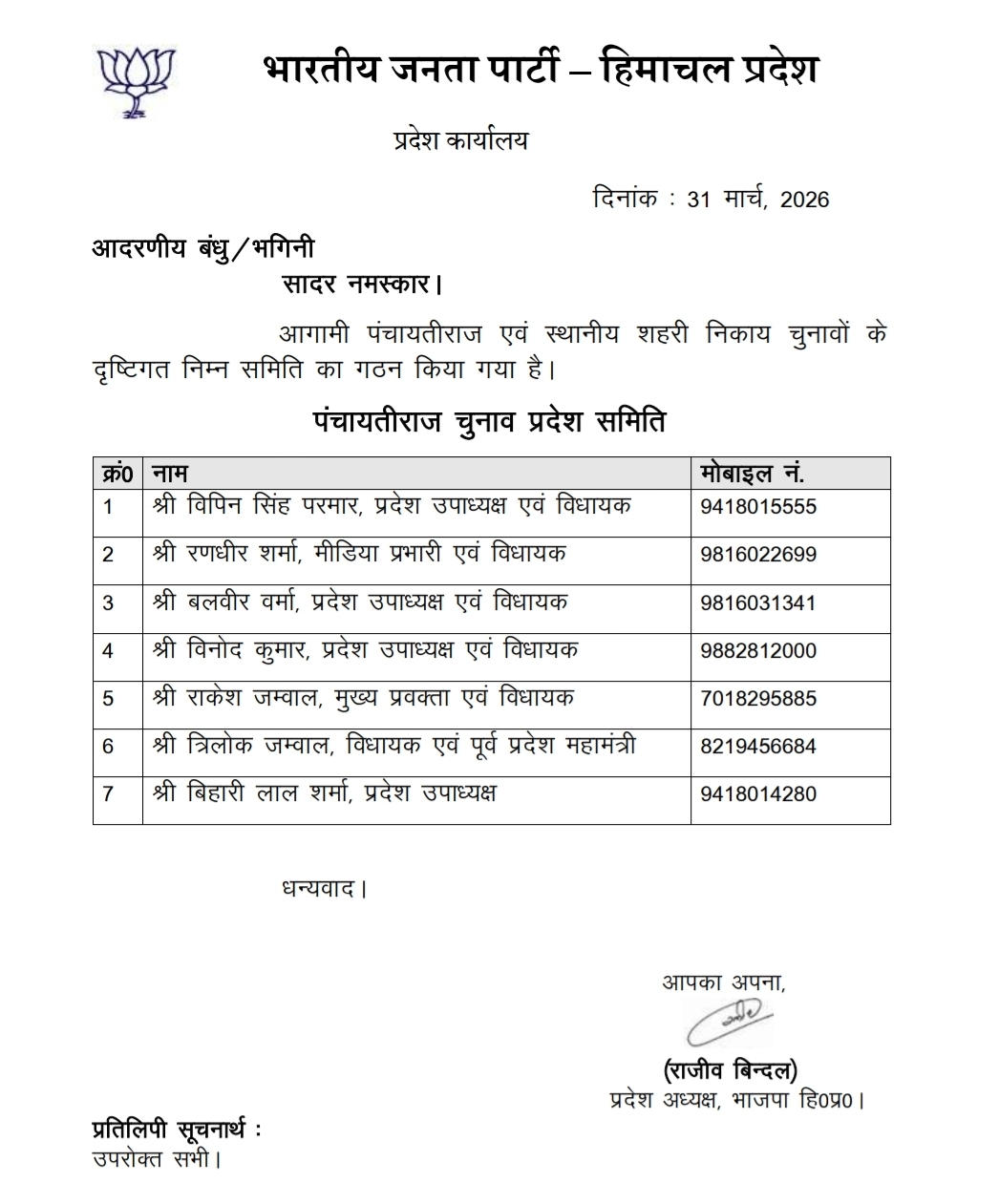 शिमला।भाजपा प्रदेश अध्यक्ष डॉ. राजीव बिंदल ने जानकारी देते हुए बताया कि आगामी पंचायतीराज एवं स्थानीय शहरी निकाय चुनावों के दृष्टिगत भारतीय जनता पार्टी, हिमाचल प्रदेश द्वारा एक प्रदेश स्तरीय समिति का गठन किया गया है। यह समिति चुनावी रणनीति, संगठन विस्तार और जमीनी स्तर पर कार्यकर्ताओं के समन्वय को सुदृढ़ करने का कार्य करेगी।