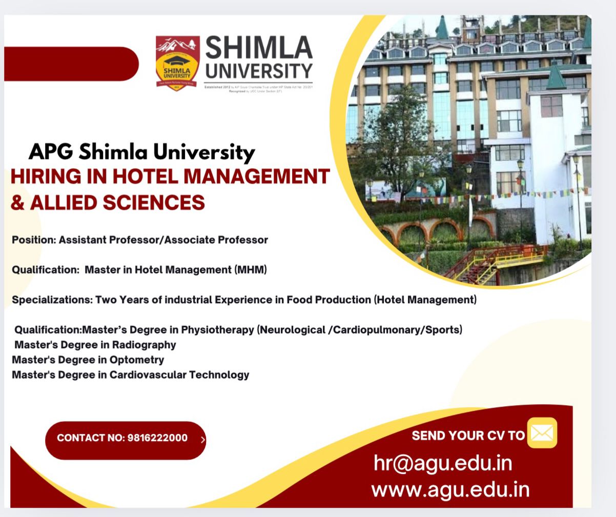 शिमला| एपीजी शिमला यूनिवर्सिटी ने होटल मैनेजमेंट एवं संबद्ध विज्ञानों के क्षेत्र में सहायक प्रोफेसर और सह प्रोफेसर पदों के लिए योग्य एवं अनुभवी उम्मीदवारों से आवेदन आमंत्रित किए हैं। विश्वविद्यालय द्वारा जारी विज्ञप्ति के अनुसार, आवेदकों के पास मास्टर इन होटल मैनेजमेंट (MHM) की डिग्री और फूड प्रोडक्शन (होटल मैनेजमेंट) में न्यूनतम दो वर्ष का औद्योगिक अनुभव होना अनिवार्य है।