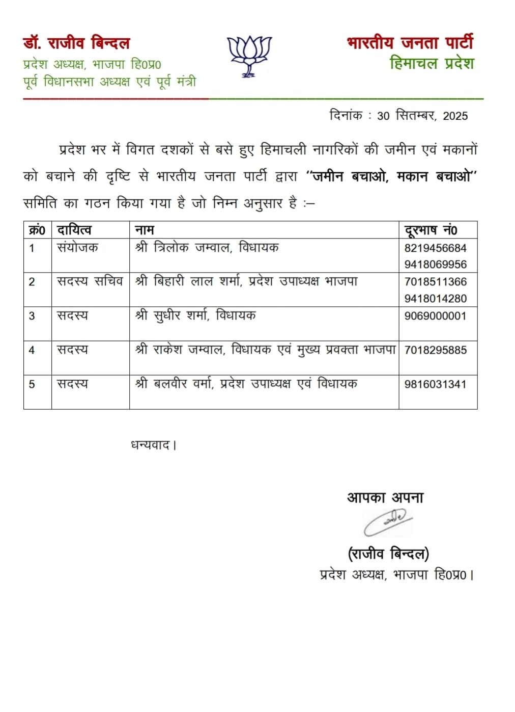 शिमला। भारतीय जनता पार्टी (भाजपा) हिमाचल प्रदेश के आईटी विभाग के प्रदेश संयोजक अनिल डड़वाल ने प्रदेश नेतृत्व से चर्चा के बाद आईटी विभाग के प्रदेश सह संयोजकों एवं कार्यसमिति सदस्यों की नई सूची जारी की है। प्रदेश सह संयोजकों के रूप में जग सिंह ठाकुर, आशीष शर्मा, निखिल ठाकुर, विजय जरयाल, आदित्य गौतम, अभिषेक चौहान को जिम्मेदारी सौंपी गई है। जबकि प्रदेश कार्यसमिति सदस्यों में गौरव धीमान, कमलेश कुमार, विनीत बहल, अरुण वर्मा, अरुष गुप्ता, राजेश कुमार ठाकुर, अजीत सिंह कैथ, मनसा राम भंगालिया, अर्जुन सिंह बिजलवान, मुकेश भारद्वाज, अजय ठाकुर, अमन डोगरा और मोंटी राणा को शामिल किया गया है।