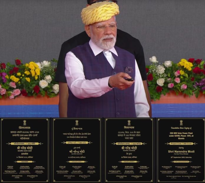 गुजरात। गुजरात के भावनगर में ऐतिहासिक अवसर पर प्रधानमंत्री नरेन्द्र मोदी ने एसजेवीएन की 200 मेगावाट की सौर विद्युत परियोजना (जीयूवीएनएल चरण-XVII) की आधारशिला रखी। यह परियोजना गुजरात राज्य विद्युत निगम लिमिटेड द्वारा कच्छ जिले के खावड़ा सोलर पार्क में विकसित की जा रही है।इस अवसर पर गुजरात के मुख्यमंत्री भूपेंद्रभाई पटेल, केंद्रीय मंत्रिमंडल के कई वरिष्ठ सदस्य सर्वानंद सोनोवाल, डॉ. मनसुख मांडविया, सी. आर. पाटिल, शान्तनु ठाकुर सहित अन्य गणमान्य अतिथि भी उपस्थित रहे। इस कार्यक्रम में वर्चुअली जुड़ते हुए एसजेवीएन के सीएमडी भूपेन्द्र गुप्ता, निदेशकगण तथा एसजीईएल के वरिष्ठ अधिकारी मौजूद रहे है। जिसमें लगभग ₹866.8 करोड़ की लागत से तैयार होने वाली यह परियोजना 31 दिसंबर 2026 तक कमीशन की जाएगी। परियोजना से पहले वर्ष में 504.92 मिलियन यूनिट और आगामी 25 वर्षों में कुल 11,620 मिलियन यूनिट स्वच्छ ऊर्जा उत्पादन की उम्मीद है। इसके अतिरिक्त, यह परियोजना 25 वर्षों में लगभग 5.69 लाख टन कार्बन उत्सर्जन में कमी लाएगी।
